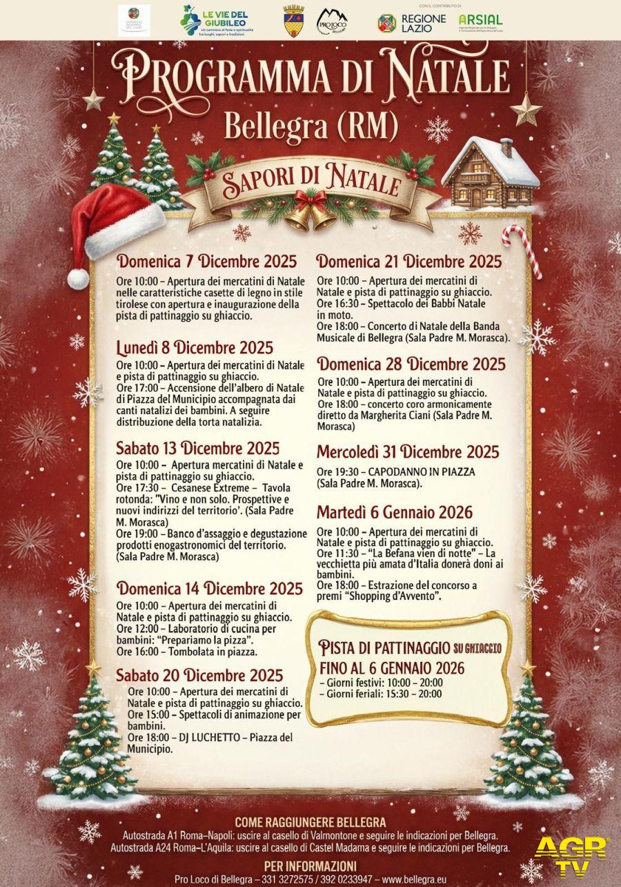 (AGR) Bellegra è pronta a indossare il suo vestito più scintillante e ad accogliere un Natale che profuma di tradizione, meraviglia e un pizzico di magia. Dal 7 dicembre al 6 gennaio con "Sapori di Natale" il paese si è trasformato in un piccolo borgo di montagna in stile tirolese, con le casette dei mercatini, le luci che scaldano il cuore e, soprattutto, la vera protagonista di queste feste: la grande pista di pattinaggio su ghiaccio, aperta tutti i giorni e destinata a diventare il punto d’incontro preferito di famiglie, bambini e pattinatori improvvisati. Nel weekend del 20 dicembre l’atmosfera è quella delle vere feste. La giornata si apre con animazione per bambini e si chiude con il dj set in Piazza del Municipio a cura di DJ Luchetto, che trasformerà il cuore del paese in un dancefloor natalizio sotto le stelle. Il giorno dopo, domenica 21, arrivano i Babbi Natale in moto e il Concerto di Natale della Banda Musicale di Bellegra, un appuntamento immancabile che scalda i cuori anche quando le temperature non collaborano.