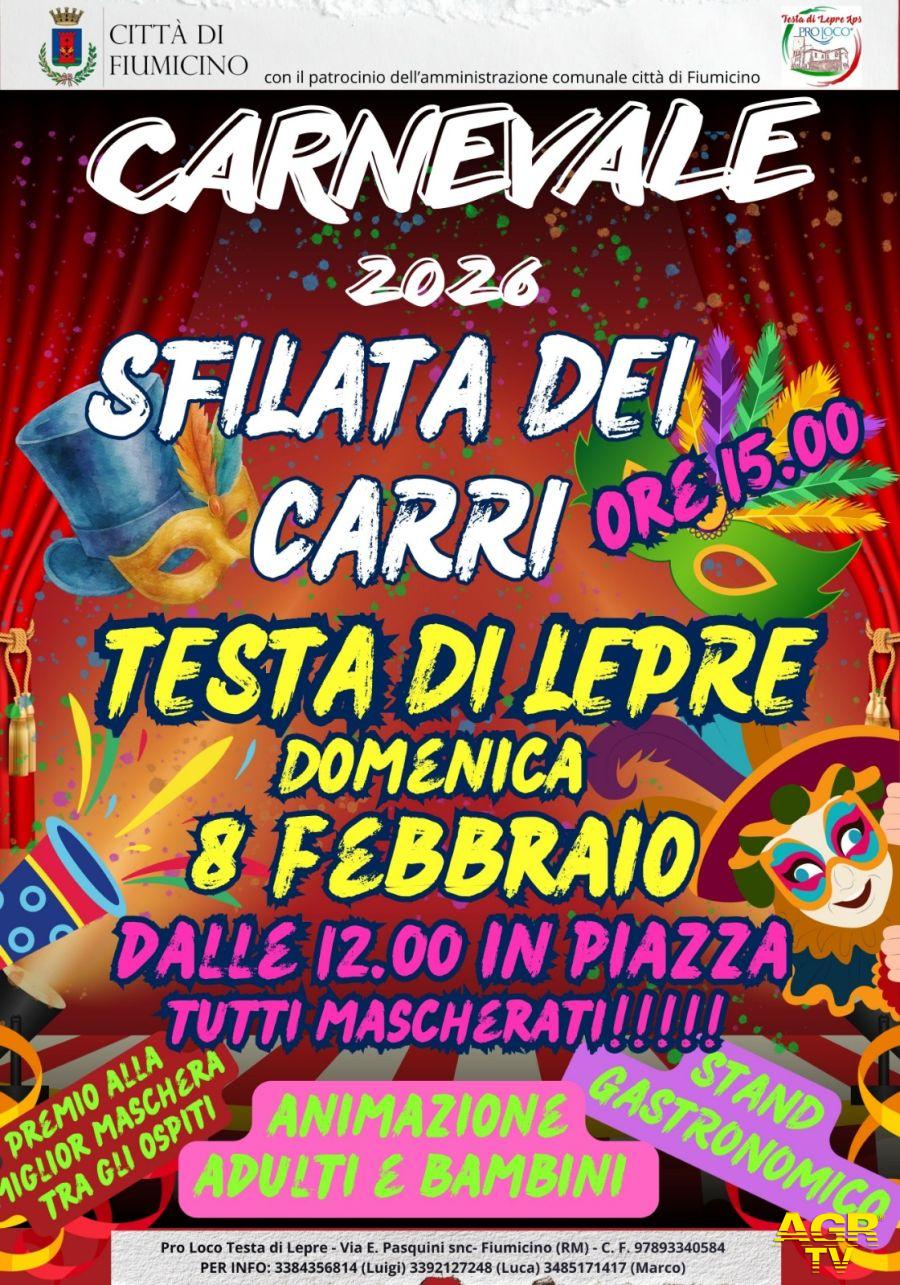 Domenica 8 febbraio, a Testa di Lepre si festeggia il Carnevale 2026. La giornata inizierà alle 12.00 in piazza, con animazione per bambini e adulti, musica e divertimento.Durante l’evento saranno allestiti stand gastronomici e sarà assegnato il premio alla miglior maschera. Alle 15.00 prenderà il via la sfilata allegorica tra colori, coriandoli e musica.L’iniziativa è promossa dalla Pro Loco di Testa di Lepre ed è patrocinata dal Comune di Fiumicino. Sarà presente ai festeggiamenti il Sindaco di Fiumicino, Mario Baccini.